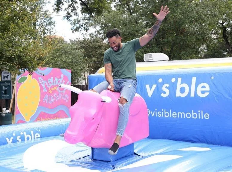 With no stores, contracts, or hidden fees, Visible is wireless without the bull. So we brought a mechanical bull to Austin to show how other wireless services take you for a wild ride. In particular, we enjoyed poking fun at the very pink wireless service sponsoring Austin City Limits with our very pink bull.